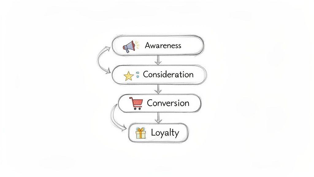 Now that you know who you're talking to, you need to understand how they buy. The customer journey is the map of their entire relationship with your brand, from the very first time they hear your name to the moment they become a loyal, repeat customer. This framework is crucial for saying the right thing at the right time.