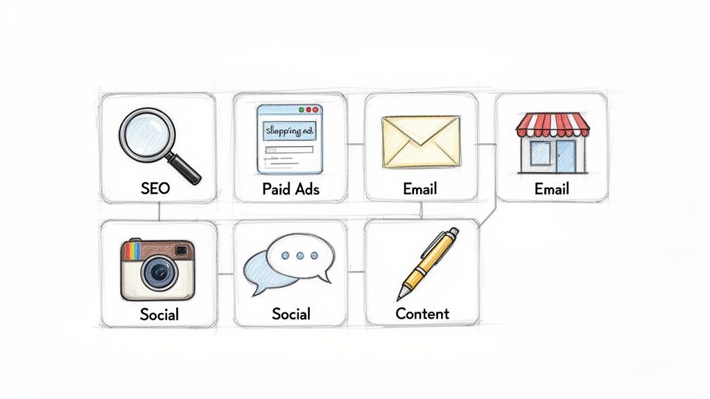 Once you have a solid grasp of your customer journey, it’s time to pick your tools. Think of marketing channels less like a checklist and more like a specialist’s toolkit—each one is designed for a specific job. The goal isn’t to be everywhere at once; it’s to show up in the right places, at the right time, with a message that actually resonates.